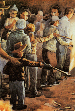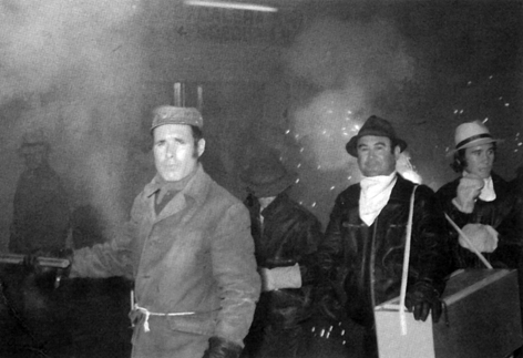 En la estrecha Calle Mayor, llena de cohetes y femelletas, de diferentes clases y modelos, es un tramo de 120 metros de largo por 8 de ancho comprendido entre la Plaza Mayor y la Calle de San Antonio. En cada cajón se sitúan tres personas, una de las cuales es ya veterana y, según turno, es la encargada de extraer los cohetes de forma que se mantenga un ritmo constante de fuego. La participación se sitúa en torno a las ciento cincuenta personas, procedentes fundamentalmente de las Peñas y Vecinos. La técnica desarrollada por tiradores y tiradoras, aprendida durante generaciones resulta fundamental para conseguir un espectáculo con ritmo, en el que, por unos minutos, el hombre es capaza de mantener un equilibrio graduado y aprovechar su especial habilidad para dominar el fuego.